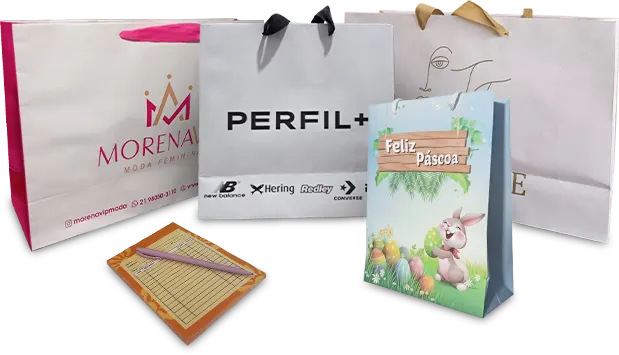 Produzimos sacolas e bolsas personalizadas, embalagens, materiais gráficos promocionais (como pastas, receituários e papelaria corporativa) e impressão offset em geral, sempre com personalização completa.